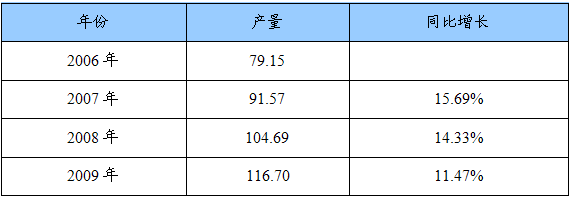 2006-2009年我国黄连素类片剂产量统计表