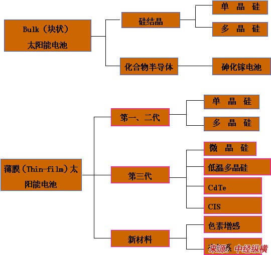 为了寻找单晶硅电池的替代品,人们除开发了多晶硅、非晶硅薄膜太阳能电池外,又不断研制其它材料的太阳能电池。其中主要包括砷化镓III-V族化合物、硫化镉、硫化镉及铜锢硒薄膜电池等。上述电池中,尽管硫化镉、碲化镉多晶薄膜电池的效率较非晶硅薄膜太阳能电池效率高,成本较单晶硅电池低,并且也易于大规模生产,但由于镉有剧毒,会对环境造成严重的污染,因此,并不是晶体硅太阳能电池最理想的替代。