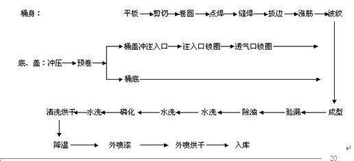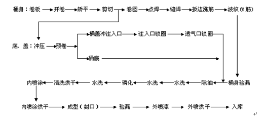 钢桶的生产工艺可分为几个步骤:首先是钢板的裁剪,顶、底盖与封闭器的冲压,然后是桶身的卷制、焊接,接下来需要扳边、涨筋、压波纹,最后是边缘倒圆使桶底盖与桶身结合,喷漆之后钢桶制作完成。