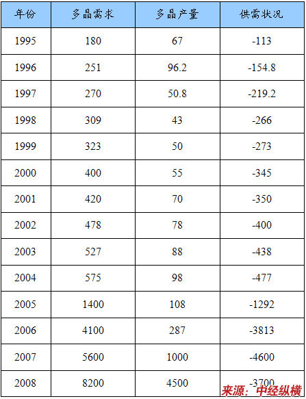 在国内及国际市场带动下,近年多晶硅需求量急剧增加,国内多晶硅的供需缺口从20世纪90年代开始,逐年扩大,严重短缺。市场将在较长时间内体现供不应求的局面。