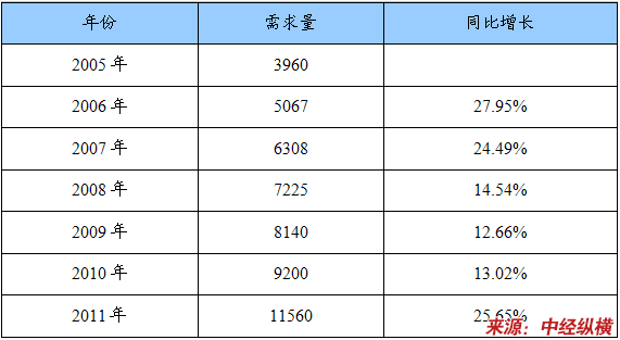 2005-2011年中国天然气辐射采暖设备需求量及同比增长