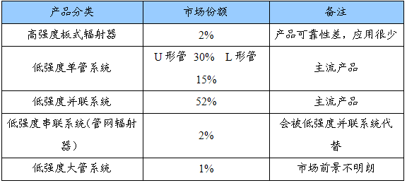 目前中国市场上的燃气辐射采暖设备主要依赖进口,一部分厂商通过代理销售国外产品,另外一部分国内的厂商多仿照国外产品进行生产,产品出口数量很少。
