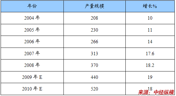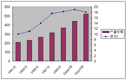 2004-2010年我国鸦胆子油乳注射液产量规模及预测增长图