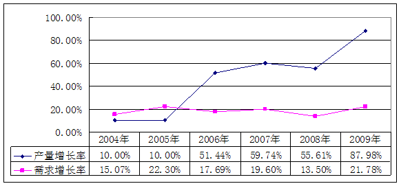 2004-2009年我国低烟无卤聚烯烃电缆料产量、需求增长率对比图