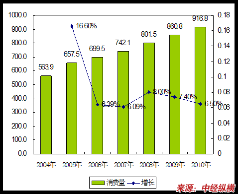 2004-2010年盐酸产品消费量 分析 及预测表