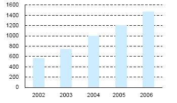 多晶硅材料之所以供应不足,一是其传统应用领域半导体需求正在稳步增长,二是太阳能电池的需求也在急剧增长。2005年太阳能电池所消耗的多晶硅材料约为1万吨,在当年生产的约3万吨多晶硅总量中相当于1/3左右。太阳能电池对多晶硅的需求自2001至2005年一直在以平均45%的年增长率持续提高,假如这种趋势继续下去的话,2007年将达到约2万吨。这几乎等于2005年用于半导体的多晶硅产量。