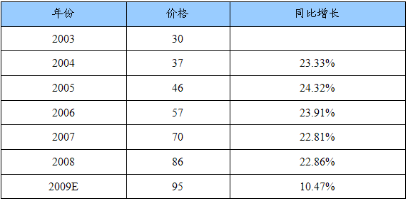 2003—2009年汽车引擎清洁剂价格趋势 分析 表