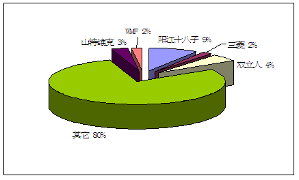 我国厨刀材料的资源得天独厚。近些年我国已成为世界上重要的钢铁生产大国,国内不锈钢、合金钢的产量增长较快。国内已形成了浙江、江苏、上海、广东和山东等厨刀制造基地,其中浙江最为突出。国内目前厨刀年产值约75亿元,其中硬质合金厨刀所占比例不足25%,与国际市场厨刀产品结构相去甚远。同时国内厨刀产品的性能和附加值普遍偏低。