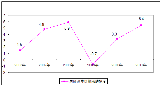 2011年12月份,全国居民消费价格总水平同比上涨4、1%。其中,城市上涨4、1%,农村上涨4、1%;食品价格上涨9、1%,非食品价格上涨1、9%;消费品价格上涨4、9%,服务项目价格上涨2、0%。全国居民消费价格总水平环比上涨0、3%。其中,城市上涨0、3%,农村上涨0、3%;食品价格上涨1、2%,非食品价格下降0、1%;消费品价格上涨0、5%,服务项目价格下降0、2%。2011年,全国居民消费价格总水平比上年上涨5、4%。