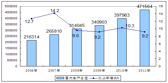 初步测算,2011全年国内生产总值471564亿元,按可比价格计算,比上年增长9、2%。分季度看,一季度同比增长9、7%,二季度增长9、5%,三季度增长9、1%,四季度增长8、9%。分产业看,第一产业增加值47712亿元,比上年增长4、5%;第二产业增加值220592亿元,增长10、6%;第三产业增加值203260亿元,增长8、9%。从环比看,四季度国内生产总值增长2、0%。