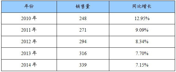 2010-2014年我国硫酸新霉素(原料药)销售量及同比增长统计表