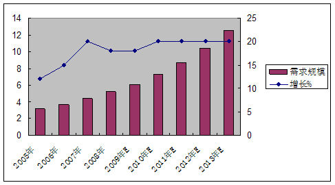 2005-2013年我国薄膜包衣预混辅料需求规模及预测增长趋势图(亿元)