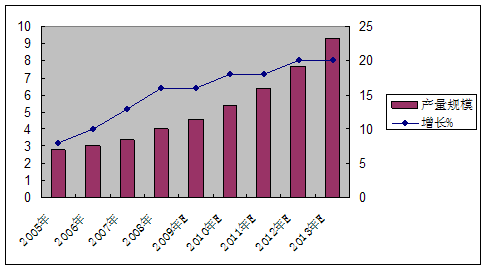 2005-2013年我国薄膜包衣预混辅料产量规模及预测增长趋势图(亿元)