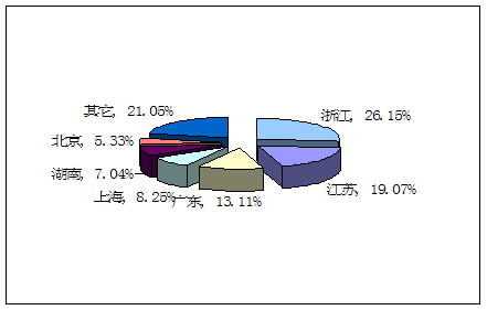 国内乳胶丝消费分布呈现出明显的区域分布特点,其分布主要是在纺织、服装产业聚集地。其中浙江、江苏、广东为国内乳胶丝最大的消费区域,产品消费量占比总消费量分别为26.15%、19.07%、13.11%。