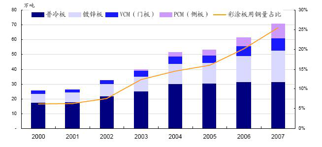 近年来,电冰箱、空调、洗衣机、冷柜和微波炉等白色家电已经成为每个家庭中不可或缺的家居电器产品,在家居中也日益起到装饰性的作用。消费者对于这些家电的外观、色泽、艺术性要求越来越高。竞争激烈的家电厂商为了实现自身产品差异化,扩张市场份额,迎合消费者需求,亦越来越重视家电产品外观与家居环境的和谐,多样化个性化将是未来家电产品的发展潮流。正是由于这一趋势,彩涂板在冰箱用钢中占比由2000年6.16%快速上升至2007年的25.48%。