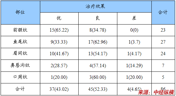 通过对北京一家美容机构的调研,病例:男性7例,女性79例,年龄平均46.8岁(21~64岁)。皮肤病变分类为:前额抬头纹23例,眉间纹24例,鱼尾纹27例,鼻唇沟纹7例,口周纹5例。