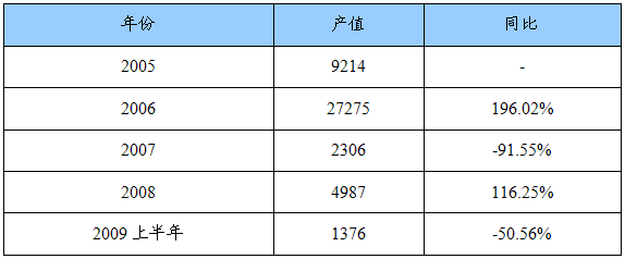 2005-2009年国内如烟雾化电子烟产值统计