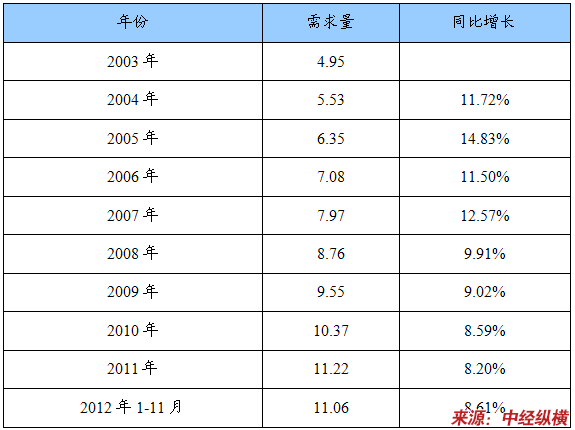 2003-2012年羽肠粉需求量及同比增长统计表
