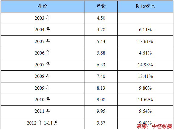 2003-2012年羽肠粉产量及同比增长统计表