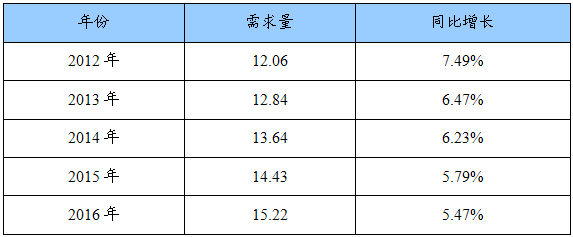 2012-2016年羽肠粉需求量及同比增长预测表