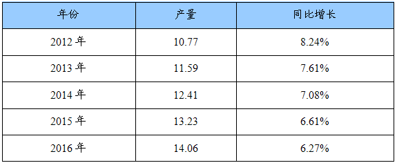2012-2016年羽肠粉产量及同比增长预测表