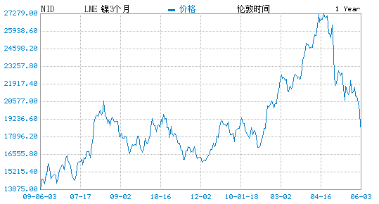 影响镍铬生铁主要因素有两个,一个是镍价,另一个是不锈钢市场需求,近一年国际镍价走势如下所示,近期镍价冲高回落,而不锈钢市场也将进入生产淡季,这两方面对于目前镍铬生铁市场价格的影响都是消极的。
