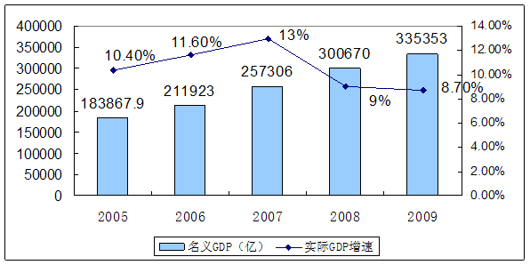 2009年国内生产总值335353亿元,比上年增长8.7%。分产业看,第一产业增加值35477亿元,增长4.2%;第二产业增加值156958亿元,增长9.5%;第三产业增加值142918亿元,增长8.9%。第一产业增加值占国内生产总值的比重为10.6%,比上年下降0.1个百分点;第二产业增加值比重为46.8%,下降0.7个百分点;第三产业增加值比重为42.6%,上升0.8个百分点。