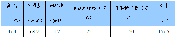 c)相关设备的参数:活性炭纤维用量:总用量为960kg,每个回收单元为320kg;蒸汽用量的用量:回收一吨乙醇精馏耗蒸汽3.5吨;公用工程消耗如表。