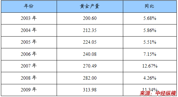 2009年中国黄金产量为313.98吨,同比增长11.34%,首次突破300吨,再创历史新高。