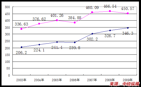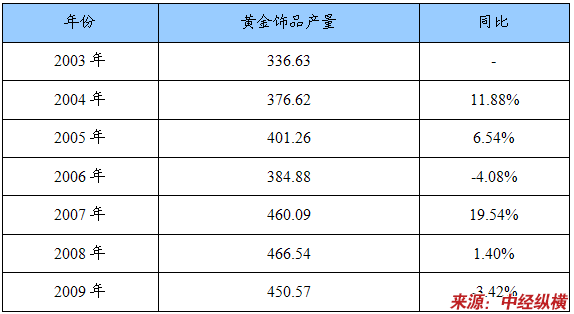 2003-2009年黄金饰品国内产量与市场整体销量对比图