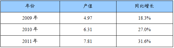 2011年,全国规模以上食品企业31735家,实现现价食品工业总产值78078.32亿元,同比增长31.6%,高出全国工业总产值增速3.7个百分点,占全国工业总产值比重9.1%。
