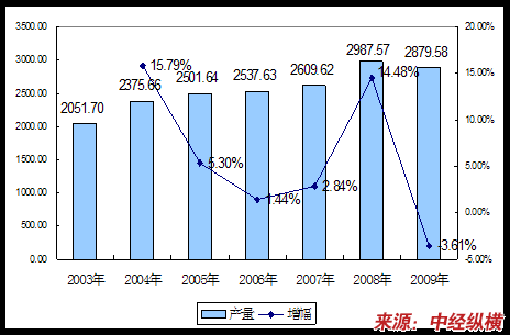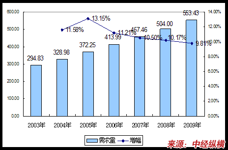 2003-2009年玉米芯产品需求量及同比增长统计图