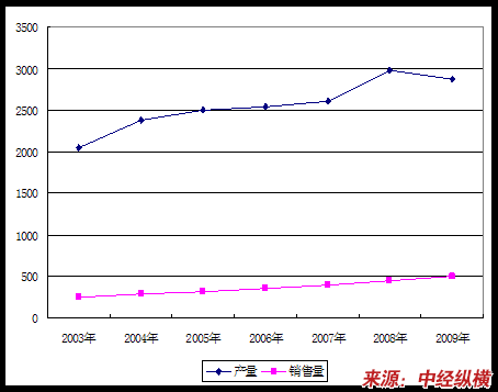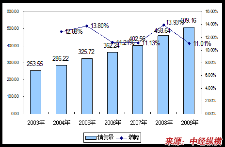 2003-2009年玉米芯销售情况量及同比增长统计图
