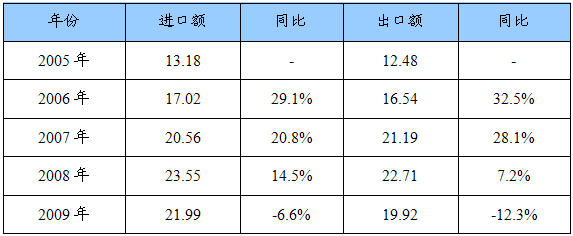 2005-2009年我国与汽车相关的几种非轮胎橡胶制品进出口额