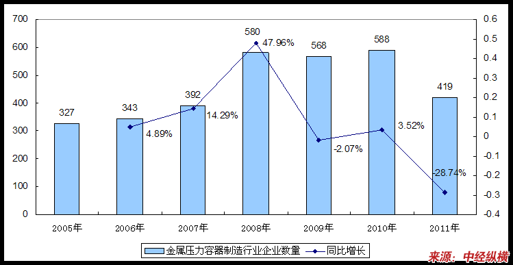 2005-2011年金属压力容器制造业企业数量及其同比增长