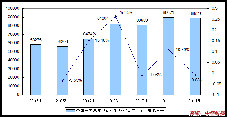 2005-2011年金属压力容器制造业从业人员及其同比增长