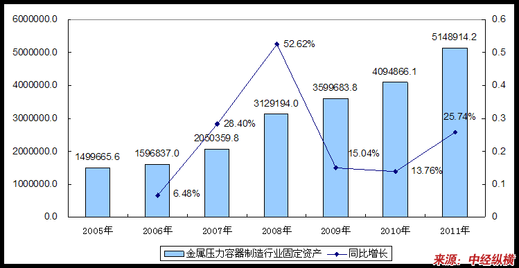 2005-2011年金属压力容器制造业固定资产总值及其同比增长