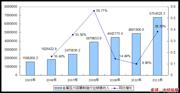 2005-2011年金属压力容器制造业销售收入及其同比增长