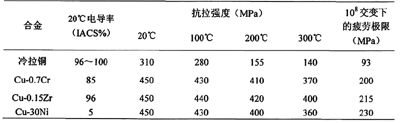 高强度高导电铜合金作为具有优良综合物理性能和力学性能的功能结构材料,它既具有较高的强度和良好的塑性,又具备优良的导电性能,还具有抗氧化、抗应力松弛、抗蠕变、抗应力腐蚀能力好,疲劳性能好,无氢脆等性能特点。高强度高导电铜合金不但克服了纯铜应用上的局限性,而且材料用量大大节省,环境适应性强,使用寿命长,是制备高速铁路电力机车架空导线芯、高速轨道交通异步牵引电动机转子等器件的优良材料。