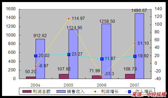 从销售收入来看,销售收入总量一直呈不断增长态势,2007年原料药的收入达1496.67亿元,这也反映了该子 行业 的需求总量的不断增加。从增长速度来看,除2006年有较大幅度下降外,其余各年均在均在20%左右。2007年的收入增速已基本回复到2006年以前水平。