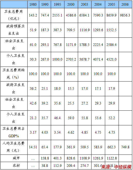 2006年,全国卫生总费用达9856.3亿元,政府、社会和个人卫生支出分别占18.0%、32.6%和49.4%;人均卫生费用749.8元,卫生总费用占GDP4.67%。2003年以来,卫生总费用和人均卫生费用递增,卫生总费用占GDP比重有所下降。四年间政府卫生支出比重增加1.0个百分点,社会卫生支出比重增加5.5个百分点,个人卫生支出比重减少6.5个百分点。统计数据显示,城市、农村居民人均卫生费用均在增长,城市居民人均卫生费用高于农村居民2倍多。预计2007年卫生总费用达到10488亿元,占GDP4.82%,人均卫生费用781元。