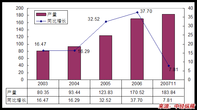 从化学原料药的生产来看,2003年的产量为80.35万吨,2004年为93.44万吨,2005年突破100万吨大关,达到123.83万吨,2007年产量至183.84万吨,呈不断增长态势。