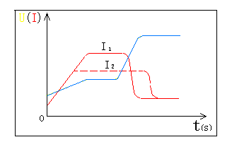 用该方式起动电机时,软起动器的输出电压迅速增加,直到输出电流达到限流值,保持输出电流不大于该值,电压逐步升高,使电动机加速,当达到额定电压、额定转速时,输出电流迅速下降至额定电流,起动过程完成,如图: