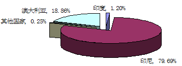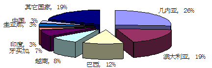 3)铝土矿进口国集中,绝大部分进口来自印尼,其次是澳大利亚。1-11月我国自印尼进口铝土矿32 121 075吨,同比增长57.55%,占同期我国铝土矿进口总量的76.69%,比重比去年同期上升3.2个百分点。1-11月我国从澳大利亚进口铝土矿总计达7668242吨,占同期我国铝土矿进口总量的18.86%,同比下降3个百分点。预计2011年全年我国从印尼进口的铝土矿仍接近80%。