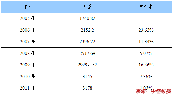 1)2011年,我国氧化铝产能仍保持较高增速,进而造成进口铝土矿的同比大幅增加。2011年,我国新增建成氧化铝产能1090万吨,新投产产能830万吨,其中新增使用进口矿的氧化铝产能440万吨,几个较大的项目集中在山东等使用进口铝土矿较多的地区。2011年,我国氧化铝建成产能已达到4879万吨,同比增长20.9%.据国际铝业协会(IAI)统计,2011年底,世界(除中国外)氧化铝总产能达6493.5万吨,同比增长2.8%.中国氧化铝产能的增速明显高于世界其他国家。2011年,中国氧化铝产能已占世界总产能的43.81%。
