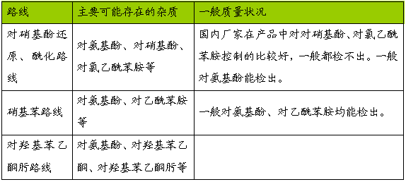 上述三种路线所生产的扑热息痛产品所含杂质各异,从质量上说并无优劣之分。从成本上说我国目前的路线最具竞争力。