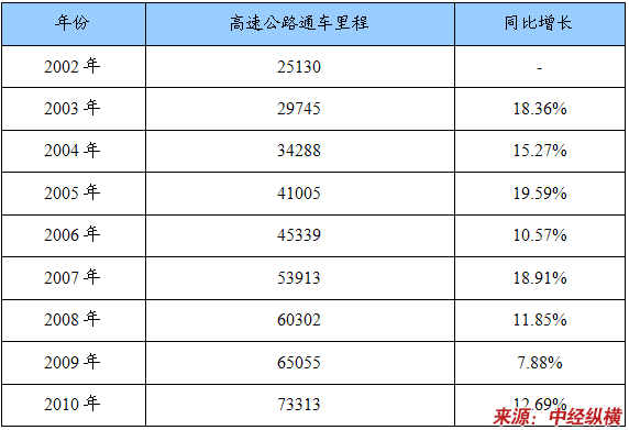 在国民经济持续高位发展的背景下,今后一段时期仍然是我国高速公路大建设时期。“十一五” 规划 中,中央政府 规划 3.8万亿人民币的交通基建投资,这个数字相比“十五”期间增长73%,国家对公路(含高速公路)建设的投资预计是人民币2.1万亿元。到2008年底,我国高速公路通车里程已达到6.03万公里,稳居世界第二位,2010年底,我国高速公路通车里程已经达到7.3万公里。