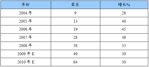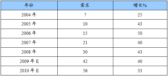 2004-2010年我国甲磺酸帕珠沙星产品需求及预测(吨)
