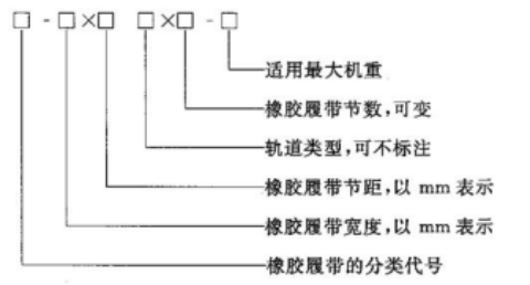400×72.5A×80—050表示履带宽度400mm,节距为72.5mm,轨道为A型,节数为80的橡胶履带,适用机重为5000kg以下的机器。