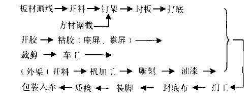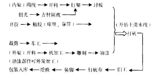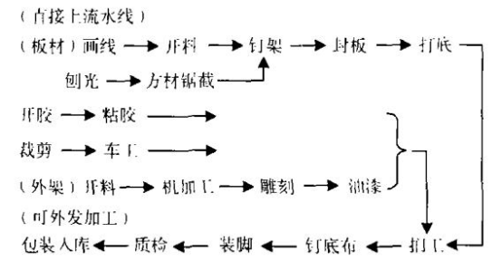 根据材料把流程分成若干工序,各工序分开作业,最后在扪工工序进行组装。这种生产方法的特点是:机械化程度低,除内架加工工序使用部分木工机械外,其它工序基本采取手工操作,工序连贯性不强,技术相对粗糙。半成品、成品的质量全靠人工掌握,误差较大,生产效率低,是一种小规模作坊式的生产方式。